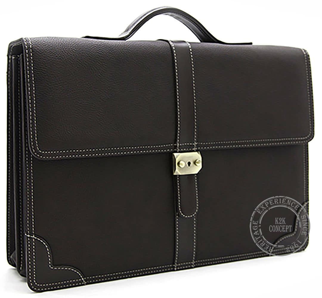 Cartable à main en cuir véritable grainé pleine fleur avec deux soufflets