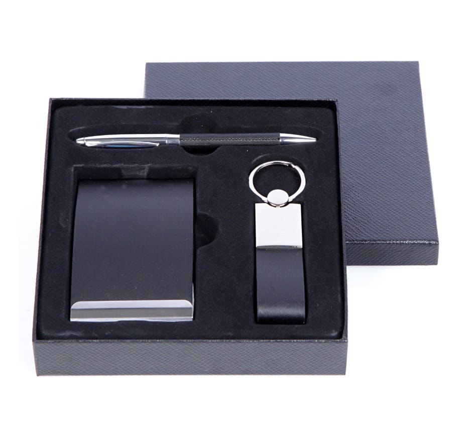 Coffret 3 pièces stylo, porte clés, porte carte visite en simili-cuir grainé mate avec emballage cartonné