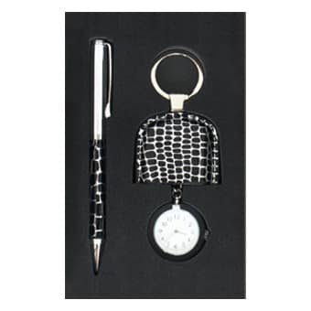 Coffret 3 pièces stylo, horloge, porte clés en simili-cuir croco brillant avec emballage cartonné
