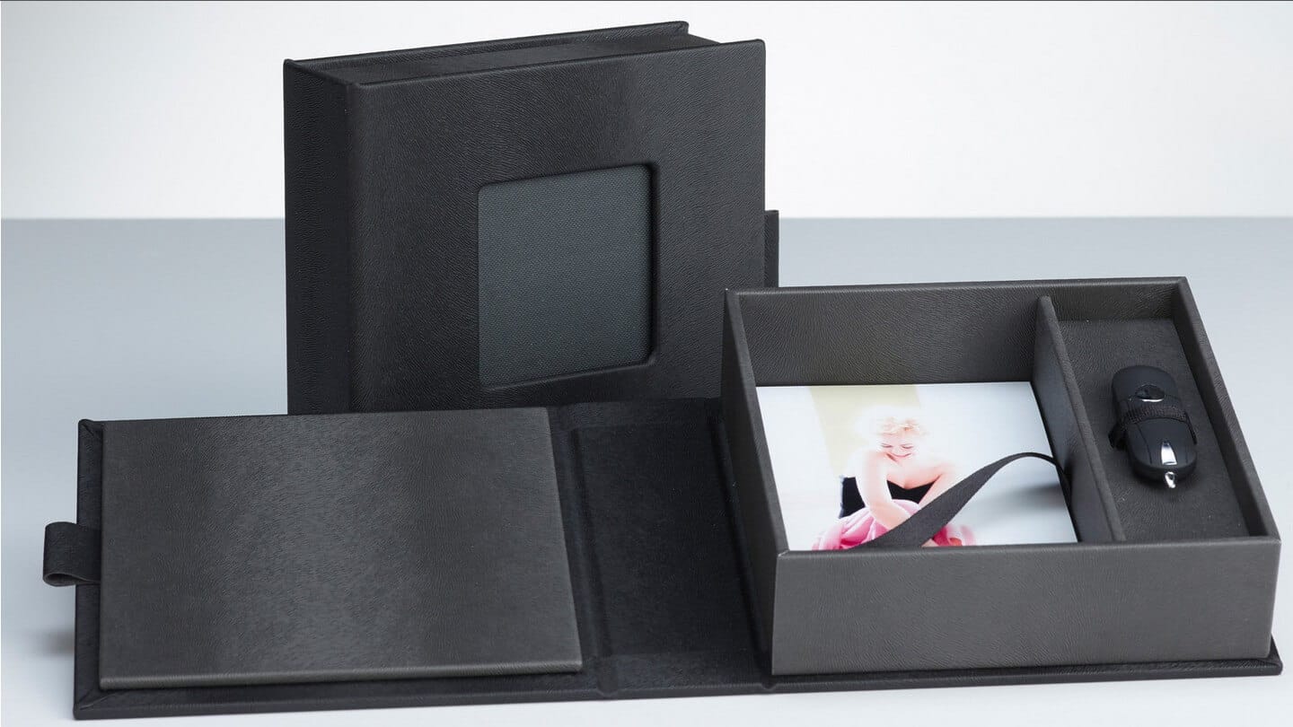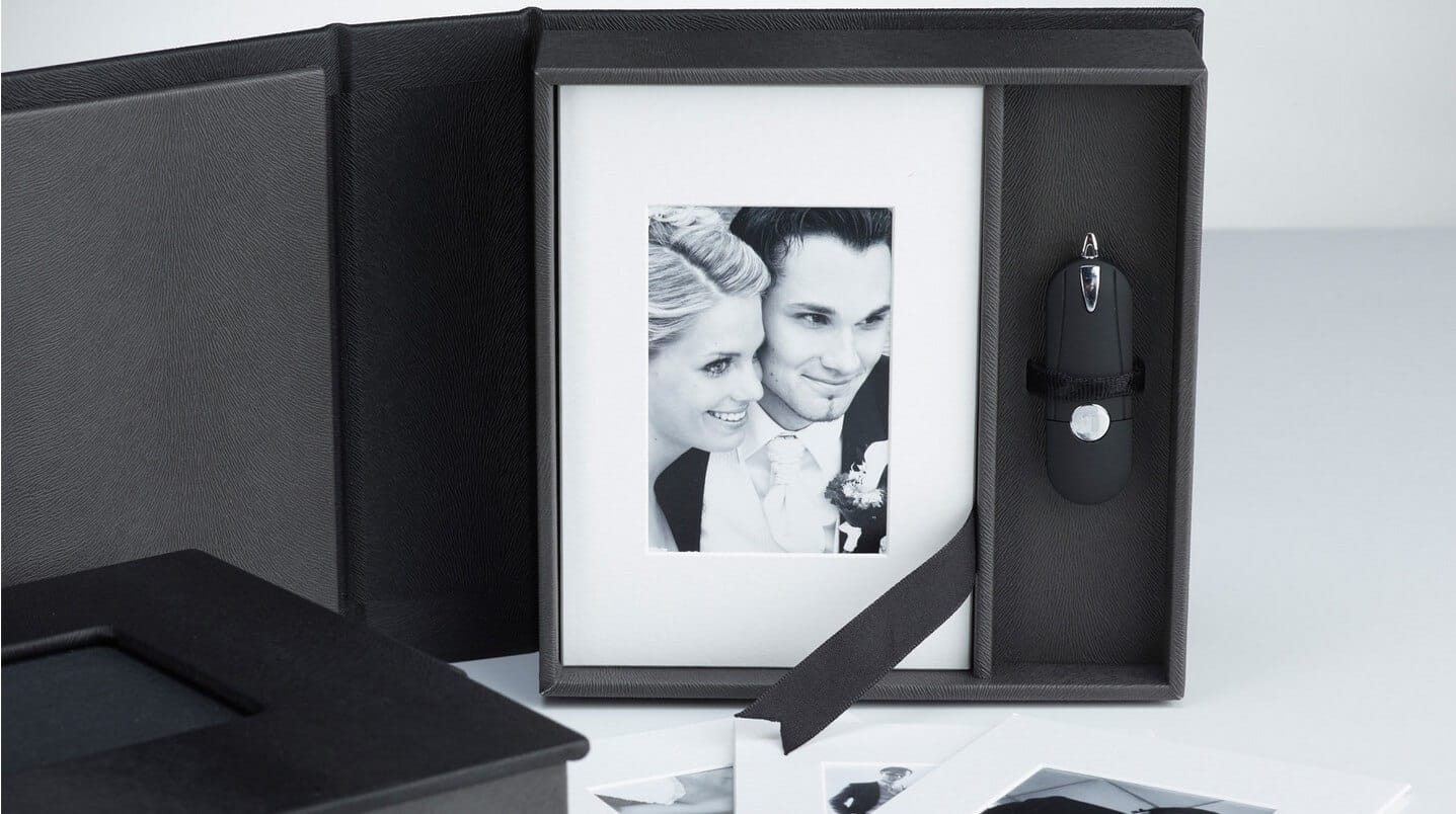 Coffret usb pour mariés avec impression en papier ou simili-cuir, incluant une clés usb en cuir & métal d’une capacité de 16Gb, aussi bien une photo principale des mariés
